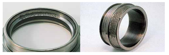 合面過盈量不足的情況下,由于滑動而使載荷點向周圍方向移動,產(chǎn)生套圈相對軸或外 殼向圓周方向位置偏離的現(xiàn)象。蠕變一旦產(chǎn)生,配合面顯著磨損,磨損粉末有可能進入 軸承內(nèi)部,形成異常磨損、滾道剝落并保持架磨損及附加載荷的過程,以至可能造成保 持架斷裂。