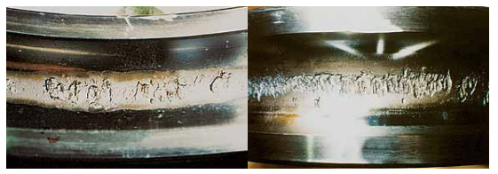 溝道單側(cè)極限位置剝落主要表現(xiàn)在溝道與擋邊交界處有嚴重的剝落環(huán)帶。產(chǎn)生原因 是軸承安裝不到位或運轉(zhuǎn)過程中突發(fā)軸向過載。采取對策是確保軸承安裝到位或?qū)⒆杂?側(cè)軸承外圈配合改為間隙配合,以期軸承過載時使軸承得到補償。如果無法確保安裝到 位,可以提高潤滑劑的油膜厚度(提高潤滑油的粘度),或減低軸承的負載等方法來減少 軸承的直接接觸。