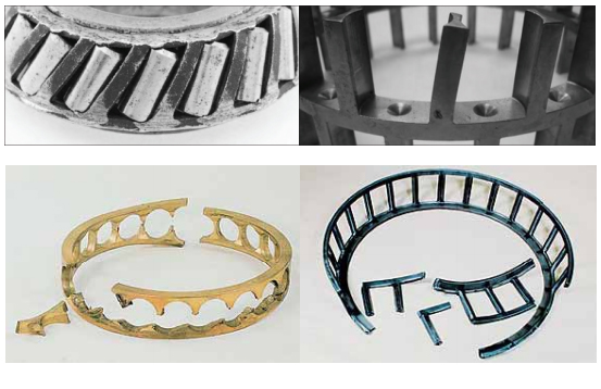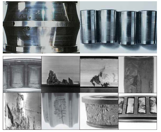 e.保持架材料缺陷(如裂紋、大塊異金屬夾雜物、縮孔、氣泡)及鉚合缺陷(缺釘、墊釘或兩半保持架結(jié)合面空隙,嚴重鉚傷)等均可能造成保持架斷裂。采取對策為在制造過 程中加以嚴格控制。