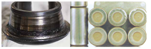 b.潤滑不良主要指軸承運轉(zhuǎn)處于貧油狀態(tài),易形成粘著磨損,使工作表面狀態(tài)惡 化,粘著磨損產(chǎn)生的撕裂物易進入保持架,使保持架產(chǎn)生異常載荷,有可能造成保持架 斷裂。