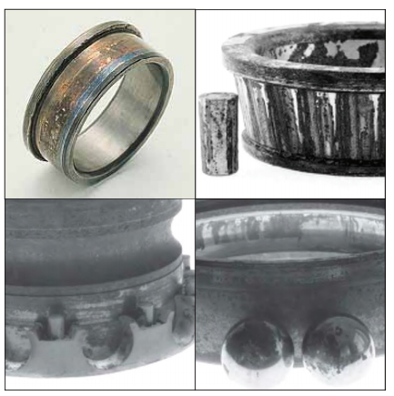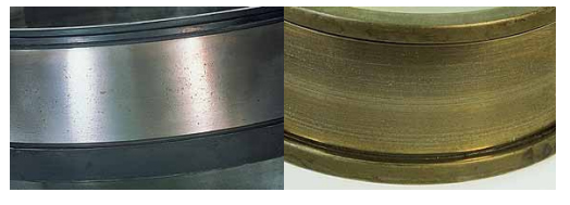 對稱位置剝落表現(xiàn)在內(nèi)圈為周圍環(huán)帶剝落,而外圈呈周向?qū)ΨQ位置剝落(即橢圓的短 軸方向),其產(chǎn)生原因主要是因為軸承箱孔橢圓過大。當軸承壓入橢圓偏大的軸承箱孔中 時,使軸承外圈產(chǎn)生橢圓,在短軸方向的游隙明顯減少甚至負游隙。軸承在載荷的作用 下,內(nèi)圈旋轉(zhuǎn)產(chǎn)生周向剝落痕跡,外圈只在短軸方向的對稱位置產(chǎn)生剝落痕跡,這是該 軸承早期試銷的主要原因。采取的對策是提高軸承箱孔加工精度。