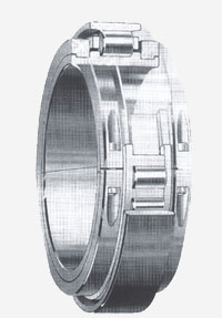 剖分式雙列圓柱滾子軸承,原米主要用于軋機(jī)的傳動(dòng)機(jī)構(gòu)。兩半外圈安裝在軸承座內(nèi)后即互相聯(lián)接在一起,也可用兒個(gè)鍵以防止其轉(zhuǎn)動(dòng)。其剖分內(nèi)圈截而與軸承中心線之間形成一夾角,使軸承轉(zhuǎn)動(dòng)時(shí)平穩(wěn),用卡箍聯(lián)接在一起。剖分式黃銅保持架由滾子定位。其軸向游隙要適合萬向節(jié)軸長度的熱膨脹變化的要求。